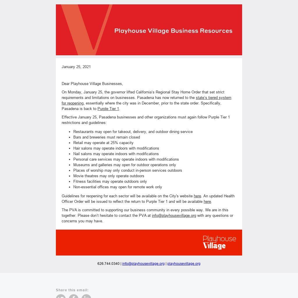 Effective January 25, Pasadena businesses and other organizations must again follow Purple Tier 1 restrictions and guidelines: