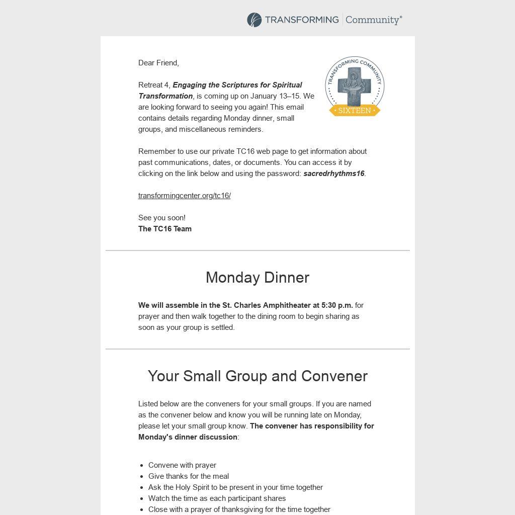 While the dinner hour can't have the same rhythm of silence-and-speaking as your group spiritual direction times, it can still contain the same spirit of allowing each person to share their experience of prayer these past three months and receiving their words with listening reverence. Before arriving, consider locating the picture of your small group and spending some time in prayer for each member.