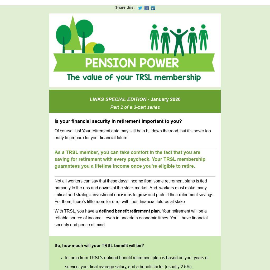 With TRSL, you have a defined benefit retirement plan. Your retirement will be a reliable source of income—even in uncertain economic times. You’ll have financial security and peace of mind.