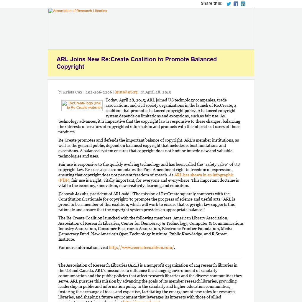 Today, April 28, 2015, ARL joined US technology companies, trade associations, and civil society organizations in the launch of Re:Create, a coalition that promotes balanced copyright policy. A balanced copyright system depends on limitations and exceptions, such as fair use. As technology advances, it is imperative that the copyright law is responsive to these changes, balancing the interests of creators of copyrighted information and products with the interests of users of those products.