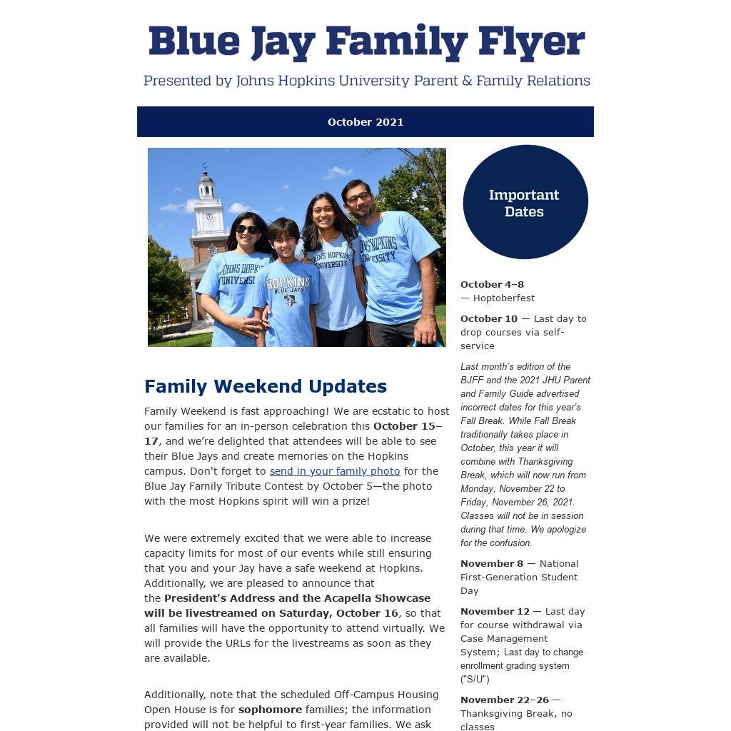 Last month’s edition of the BJFF and the 2021 JHU Parent and Family Guide advertised incorrect dates for this year’s Fall Break. While Fall Break traditionally takes place in October, this year it will combine with Thanksgiving Break, which will now run from Monday, November 22 to Friday, November 26, 2021. Classes will not be in session during that time. We apologize for the confusion.