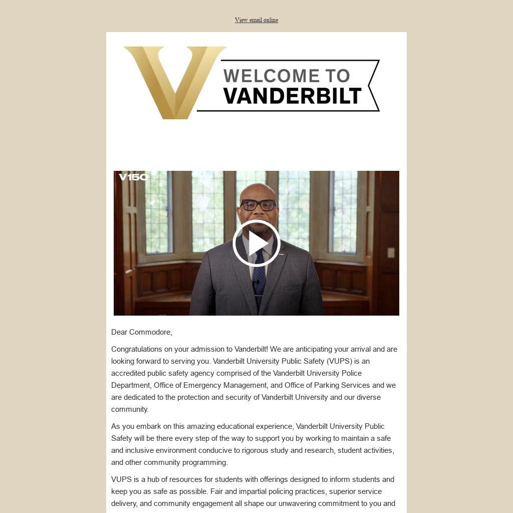 Congratulations on your admission to Vanderbilt! We are anticipating your arrival and are looking forward to serving you. Vanderbilt University Public Safety (VUPS) is an accredited public safety agency comprised of the Vanderbilt University Police Department, Office of Emergency Management, and Office of Parking Services and we are dedicated to the protection and security of Vanderbilt University and our diverse community.