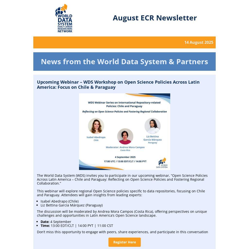 The World Data System (WDS) invites you to participate in our upcoming webinar, “Open Science Policies Across Latin America – Chile and Paraguay: Reflecting on Open Science Policies and Fostering Regional Collaboration.”