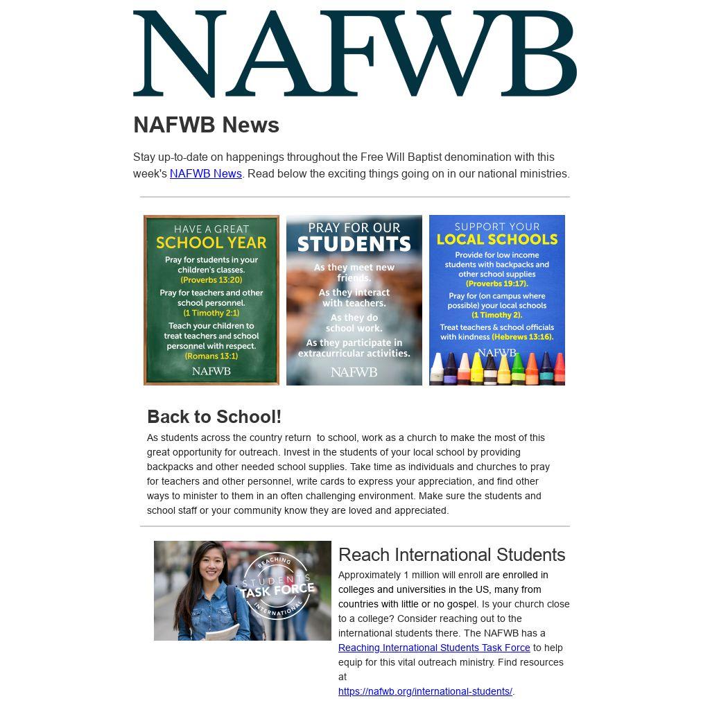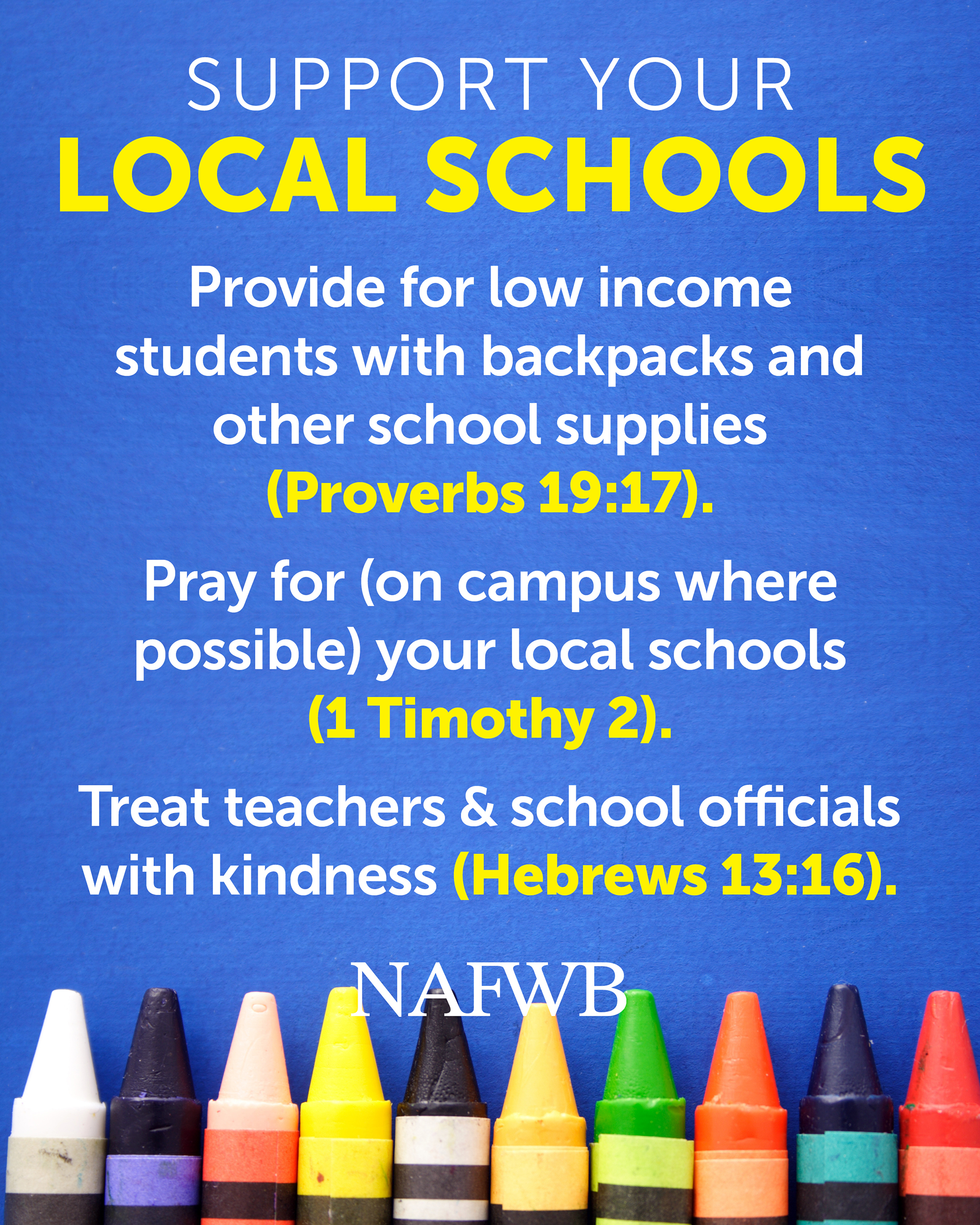 As students across the country return to school, work as a church to make the most of this great opportunity for outreach. Invest in the students of your local school by providing backpacks and other needed school supplies. Take time as individuals and churches to pray for teachers and other personnel, write cards to express your appreciation, and find other ways to minister to them in an often challenging environment. Make sure the students and school staff or your community know they are loved and appreciated.