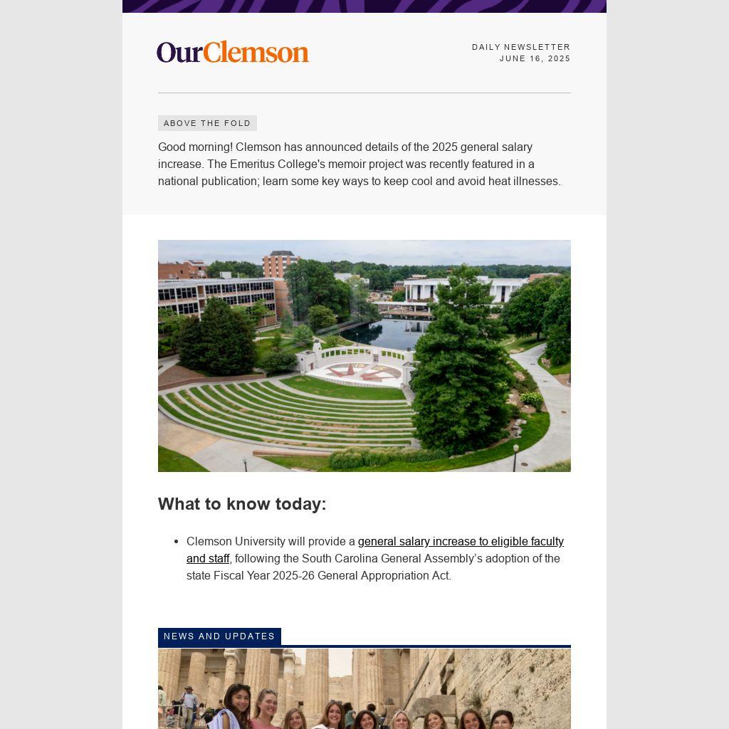 Good morning! Clemson has announced details of the 2025 general salary increase. The Emeritus College's memoir project was recently featured in a national publication; learn some key ways to keep cool and avoid heat illnesses.