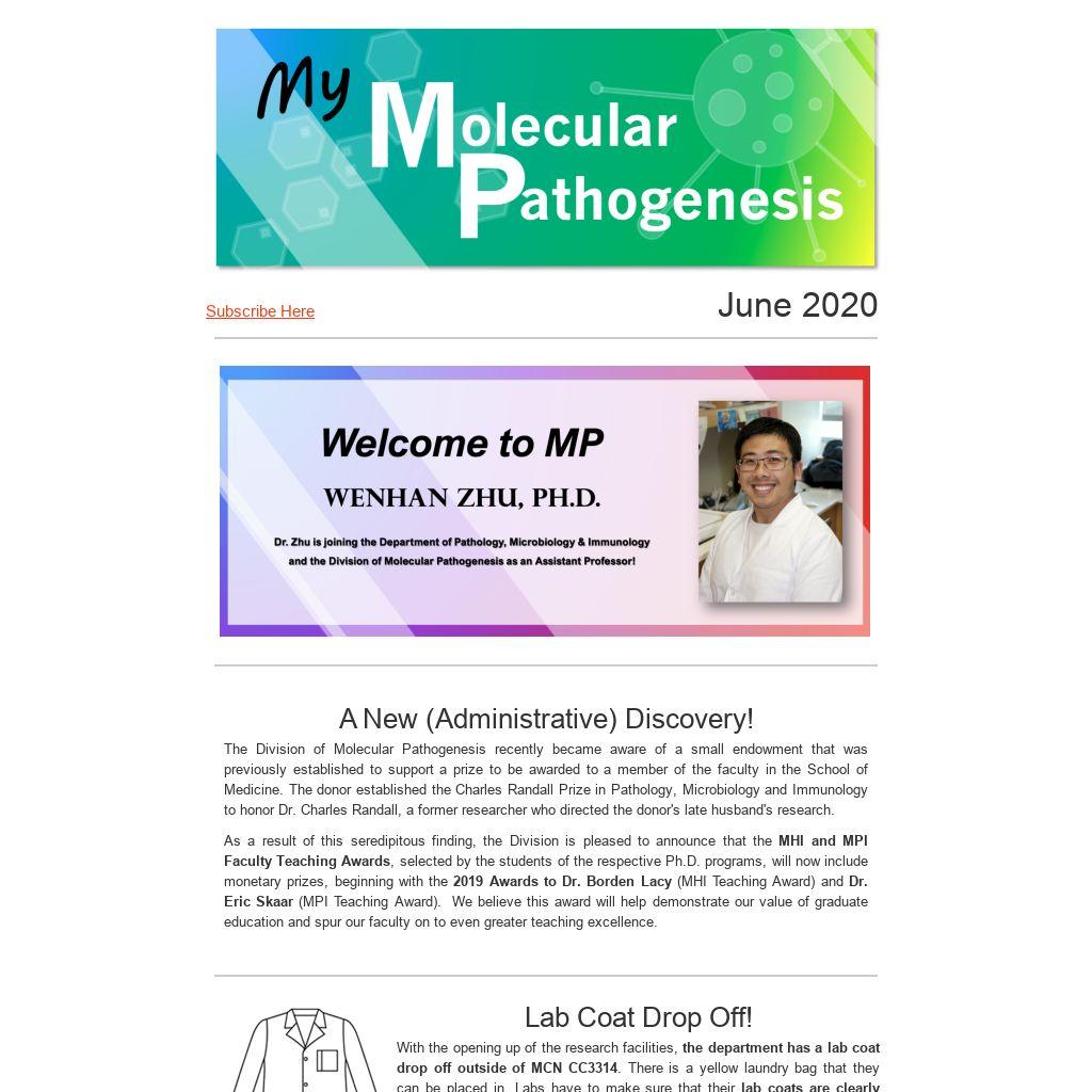 A New (Administrative) Discovery!The Division of Molecular Pathogenesis recently became aware of a small endowment that was previously established to support a prize to be awarded to a member of the faculty in the School of Medicine. The donor established the Charles Randall Prize in Pathology, Microbiology and Immunology to honor Dr. Charles Randall, a former researcher who directed the donor's late husband's research.