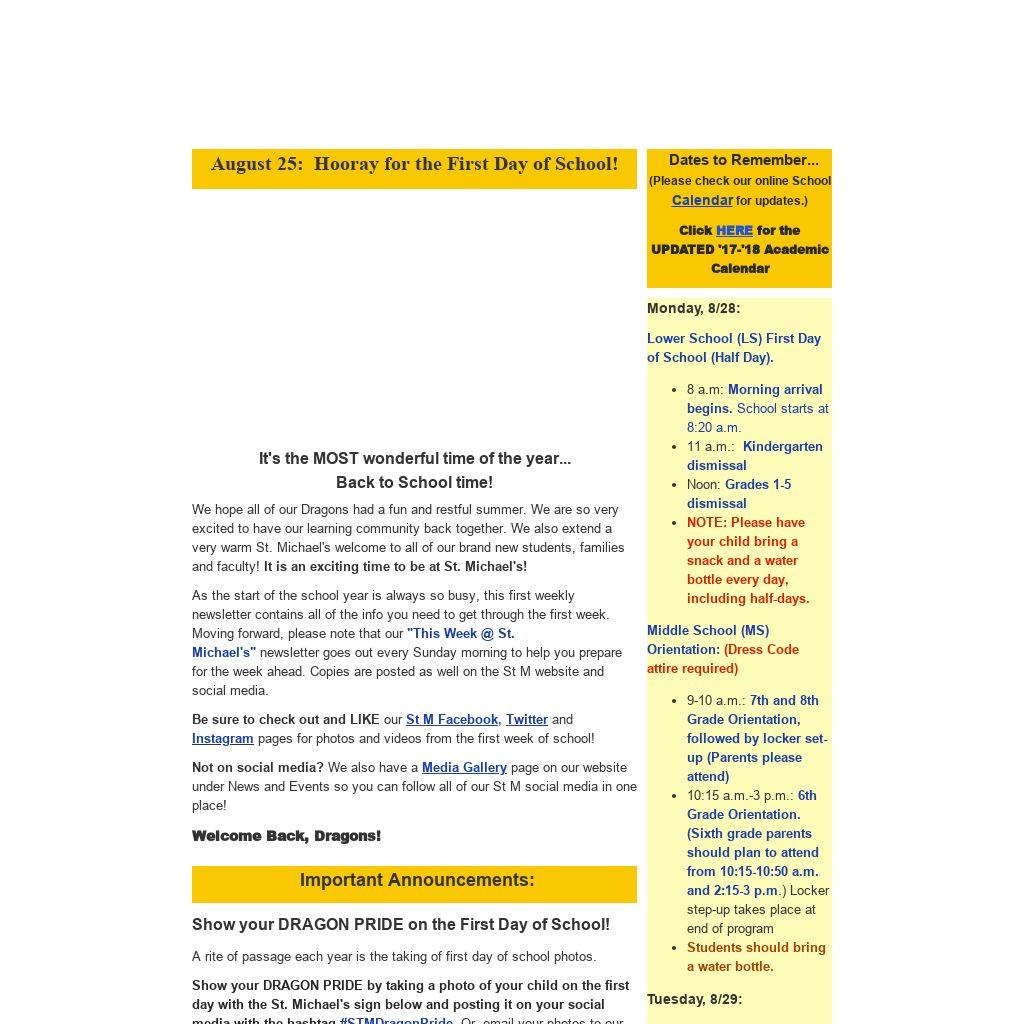 As the start of the school year is always so busy, this first weekly newsletter contains all of the info you need to get through the first week. Moving forward, please note that our "This Week @ St. Michael's" newsletter goes out every Sunday morning to help you prepare for the week ahead. Copies are posted as well on the St M website and social media. Not on social media? We also have a Media Gallery page on our website under News and Events so you can follow all of our St M social media in one place! Welcome Back, Dragons!