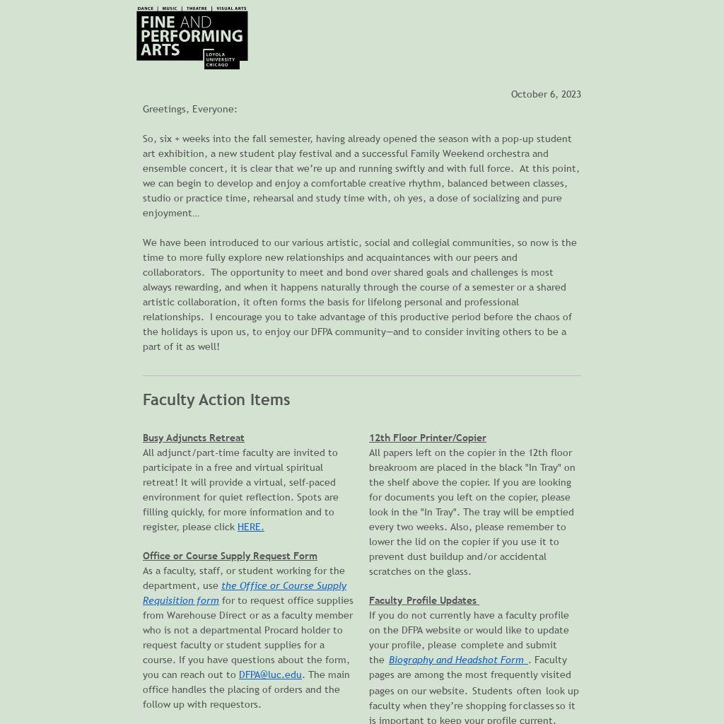 For academic inquiries, contact the DFPA office: 773.508.7510 or DFPA@LUC.edu