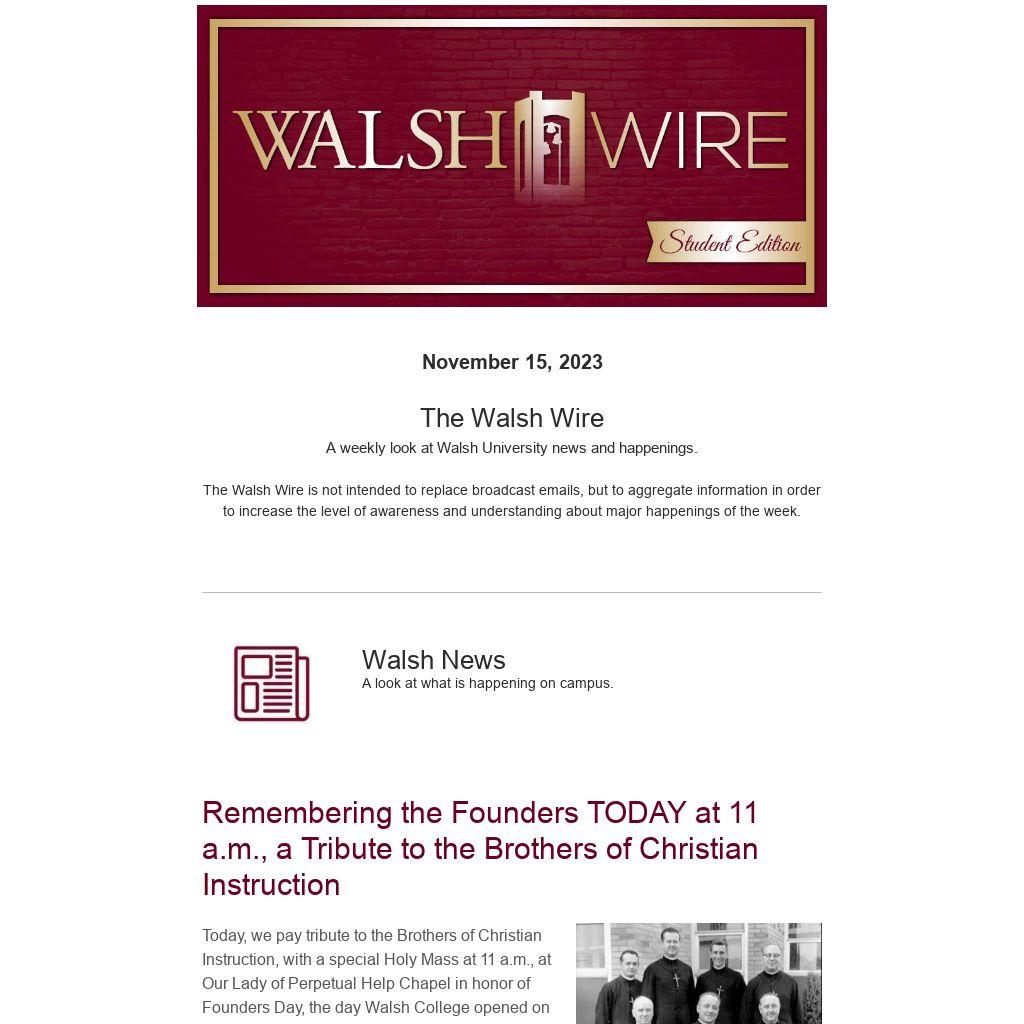 Today, we pay tribute to the Brothers of Christian Instruction, with a special Holy Mass at 11 a.m., at Our Lady of Perpetual Help Chapel in honor of Founders Day, the day Walsh College opened on November 17, 1960. Later this evening, at 8 p.m., Campus Ministry will host a hot chocolate social themed “Remembering the Founders” in the lower level of the Chapel. Faculty, staff and alumni will offer memories and anecdotes about the heritage of Walsh and the human stories of the Brothers of Christian Instruction at Walsh. On Thursday, Nov. 16, join the Peacemakers for late-night pancakes with toppings from 8-10 p.m., in the Connector.