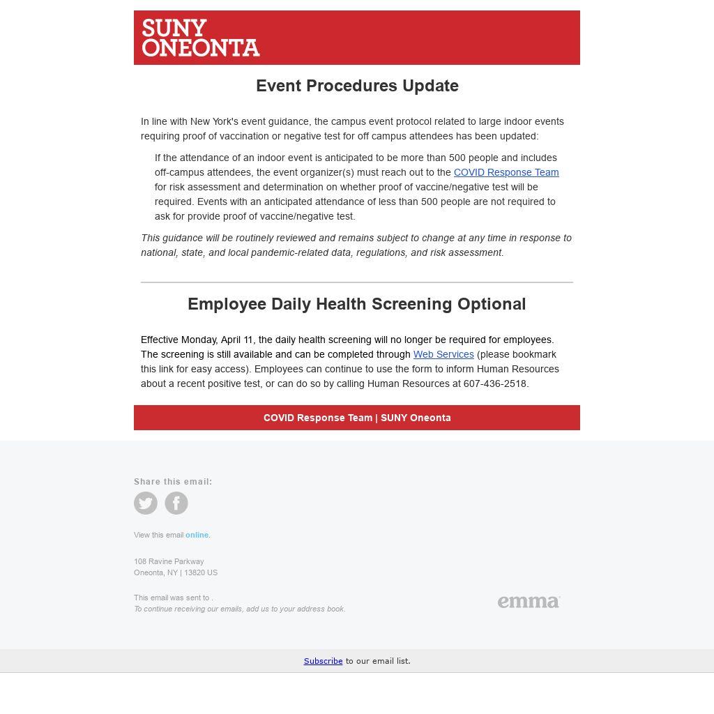 In line with New York's event guidance, the campus event protocol related to large indoor events requiring proof of vaccination or negative test for off campus attendees has been updated: