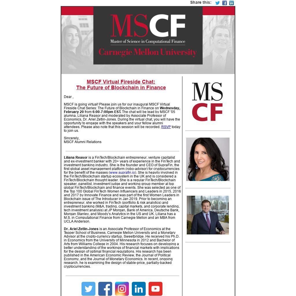 MSCF is going virtual! Please join us for our inaugural MSCF Virtual Fireside Chat Series: The Future of Blockchain in Finance on