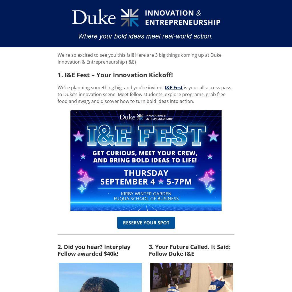 We’re planning something big, and you’re invited. I&E Fest is your all-access pass to Duke’s innovation scene. Meet fellow students, explore programs, grab free food and swag, and discover how to turn bold ideas into action.