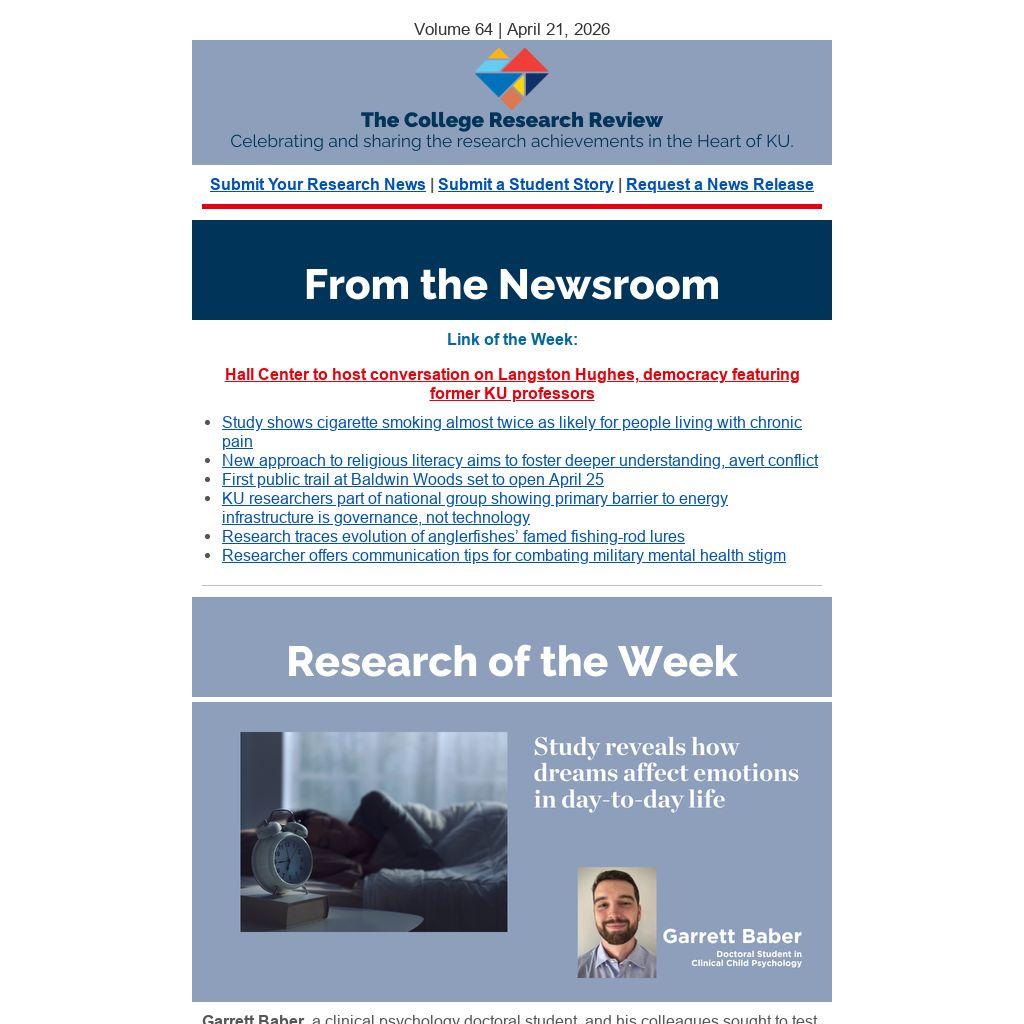 Garrett Baber, a clinical psychology doctoral student, and his colleagues sought to test whether emotions experienced within dreams — like fear and joy — change feelings the following morning. To find out, they analyzed dream reports from more than 500 people, employing machine learning to sort emotions reported in dreams. Then they compared those dreamt emotions to participants’ emotional states the following day.Their findings were published in the peer-reviewed journal Sleep. Read the full story.