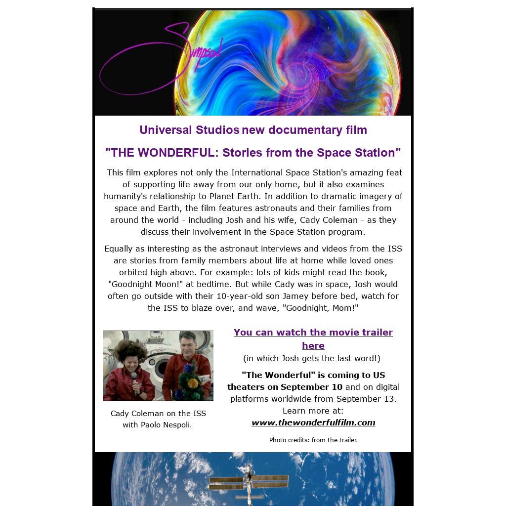 This film explores not only the International Space Station's amazing feat of supporting life away from our only home, but it also examines humanity's relationship to Planet Earth. In addition to dramatic imagery of space and Earth, the film features astronauts and their families from around the world - including Josh and his wife, Cady Coleman - as they discuss their involvement in the Space Station program.