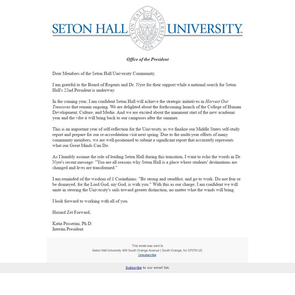 As I humbly assume the role of leading Seton Hall during this transition, I want to echo the words in Dr. Nyre's recent message: "You are all reasons why Seton Hall is a place where students' destinations are changed and lives are transformed."