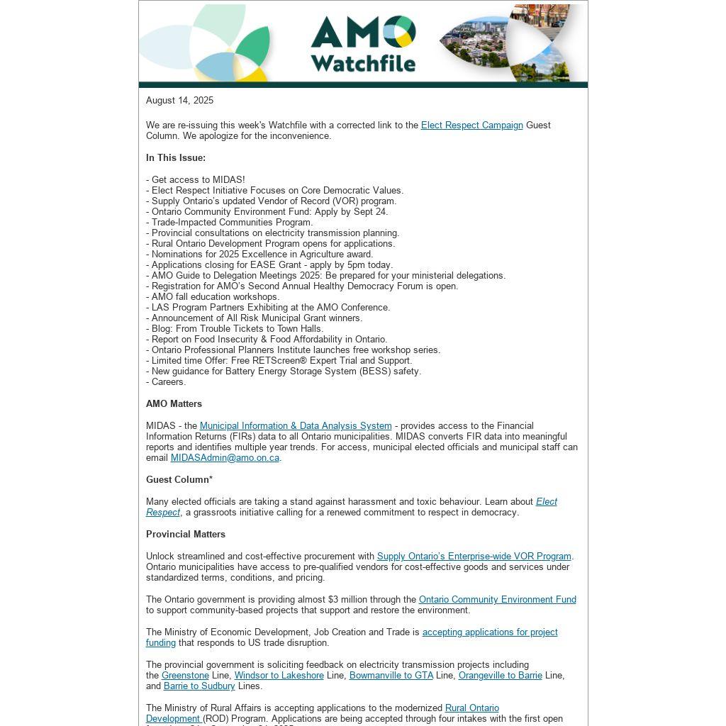 AMO is pleased to support OPPI in developing a series of free workshops, offered both in person and virtually, to address the shortage of planners in Ontario. Registration will open late August, so stay tuned.