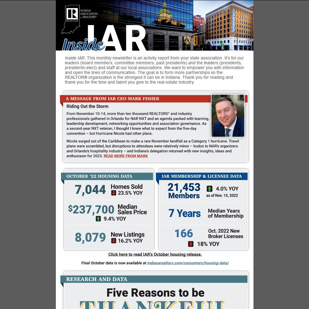 Inside IAR. This monthly newsletter is an activity report from your state association. It’s for our leaders (board members, committee members, past presidents) and the leaders (presidents, presidents-elect) and staff at our local associations. We want to empower you with information and open the lines of communication. The goal is to form more partnerships so the REALTOR® organization is the strongest it can be in Indiana. Thank you for reading and thank you for the time and talent you give to the real estate industry.