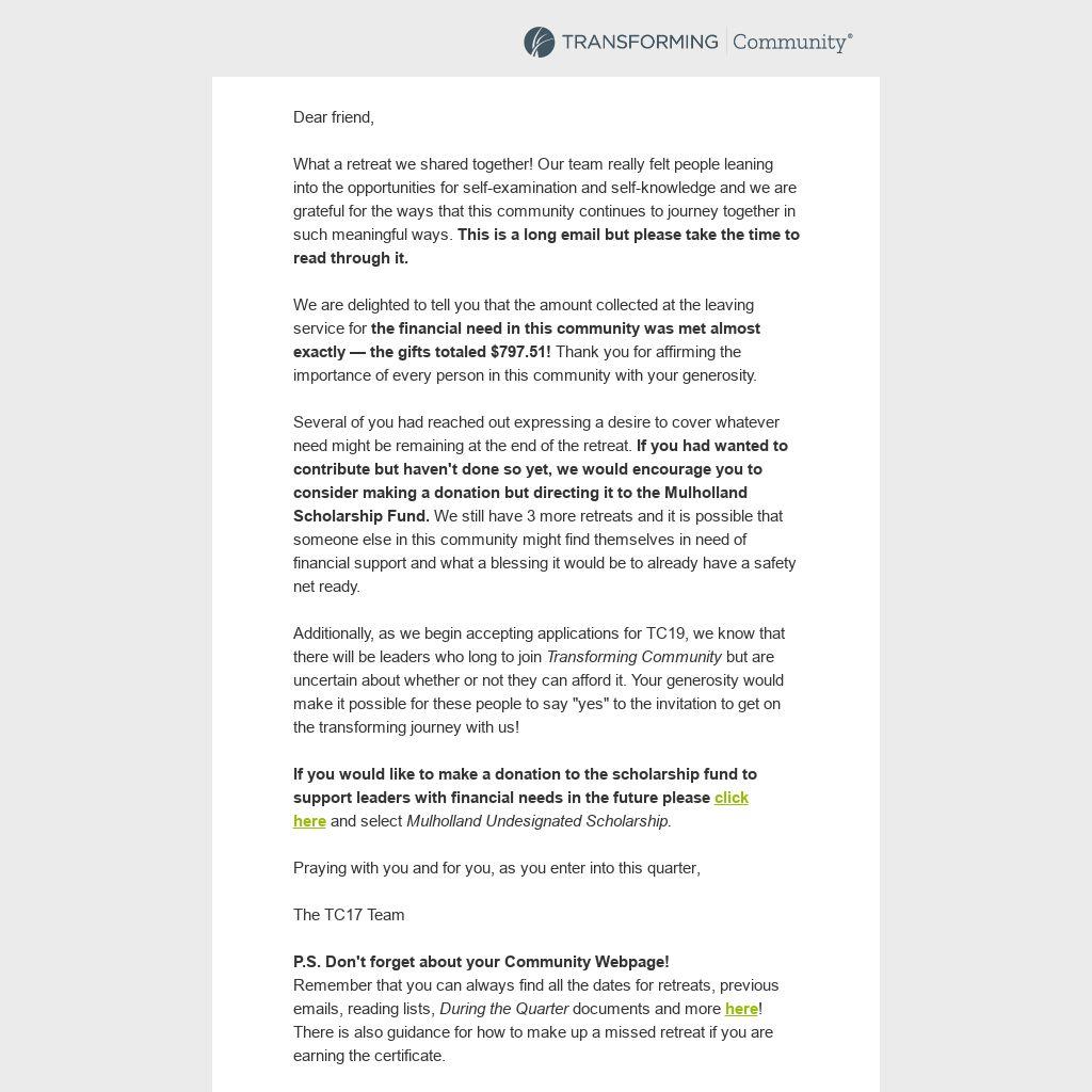 Several of you had reached out expressing a desire to cover whatever need might be remaining at the end of the retreat. If you had wanted to contribute but haven't done so yet, we would encourage you to consider making a donation but directing it to the Mulholland Scholarship Fund. We still have 3 more retreats and it is possible that someone else in this community might find themselves in need of financial support and what a blessing it would be to already have a safety net ready.