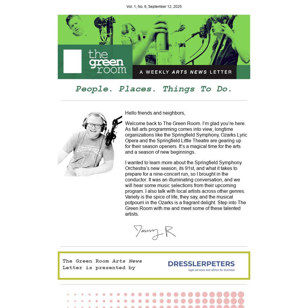 Welcome back to The Green Room. I’m glad you’re here. As fall arts programming comes into view, longtime organizations like the Springfield Symphony, Ozarks Lyric Opera and the Springfield Little Theatre are gearing up for their season openers. It’s a magical time for the arts and a season of new beginnings.