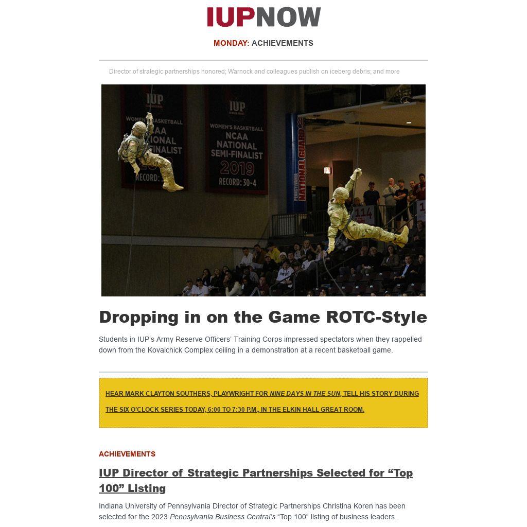 Distributed to IUP employees and students twice a week, IUP Now is the official newsletter of Indiana University of Pennsylvania. It features news from across the IUP website, compiled by the Division of Marketing and Communications. Find out how to get your news and events in IUP Now.