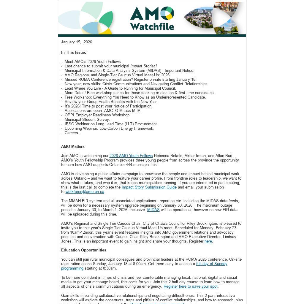 AMO is developing a public affairs campaign to showcase the people and impact behind municipal work across Ontario – and we want to feature your career profile. From frontline roles to leadership, we want to show what it takes, and who it is, that keeps municipalities running. If you are interested in participating, this is the last call to complete the Impact Story Submission Guide and email your submission to workforce@amo.on.ca.