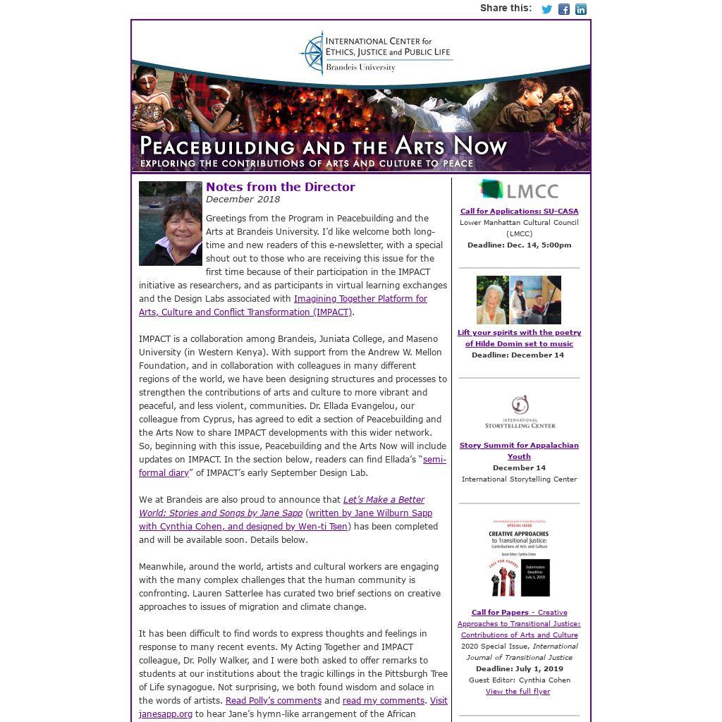 Greetings from the Program in Peacebuilding and the Arts at Brandeis University. I’d like welcome both long-time and new readers of this e-newsletter, with a special shout out to those who are receiving this issue for the first time because of their participation in the IMPACT initiative as researchers, and as participants in virtual learning exchanges and the Design Labs associated with Imagining Together Platform for Arts, Culture and Conflict Transformation (IMPACT).