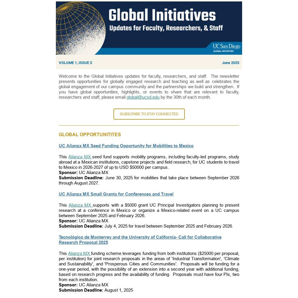 Welcome to the Global Initiatives updates for faculty, researchers, and staff. The newsletter presents opportunities for globally engaged research and teaching as well as celebrates the global engagement of our campus community and the partnerships we build and strengthen. If you have global opportunities, highlights, or events to share that are relevant to faculty, researchers and staff, please email global@ucsd.edu by the 30th of each month.