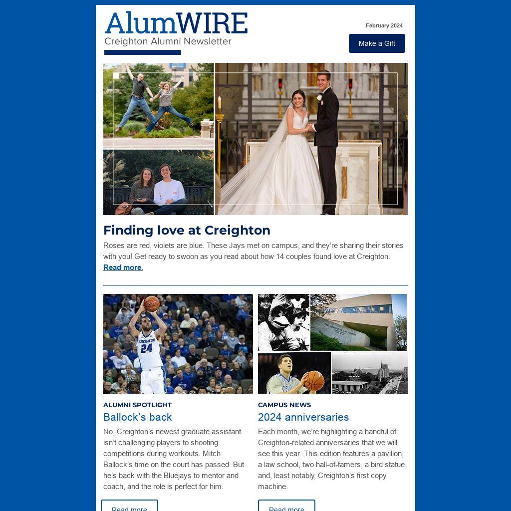 Roses are red, violets are blue. These Jays met on campus, and they’re sharing their stories with you! Get ready to swoon as you read about how 14 couples found love at Creighton. Read more.
