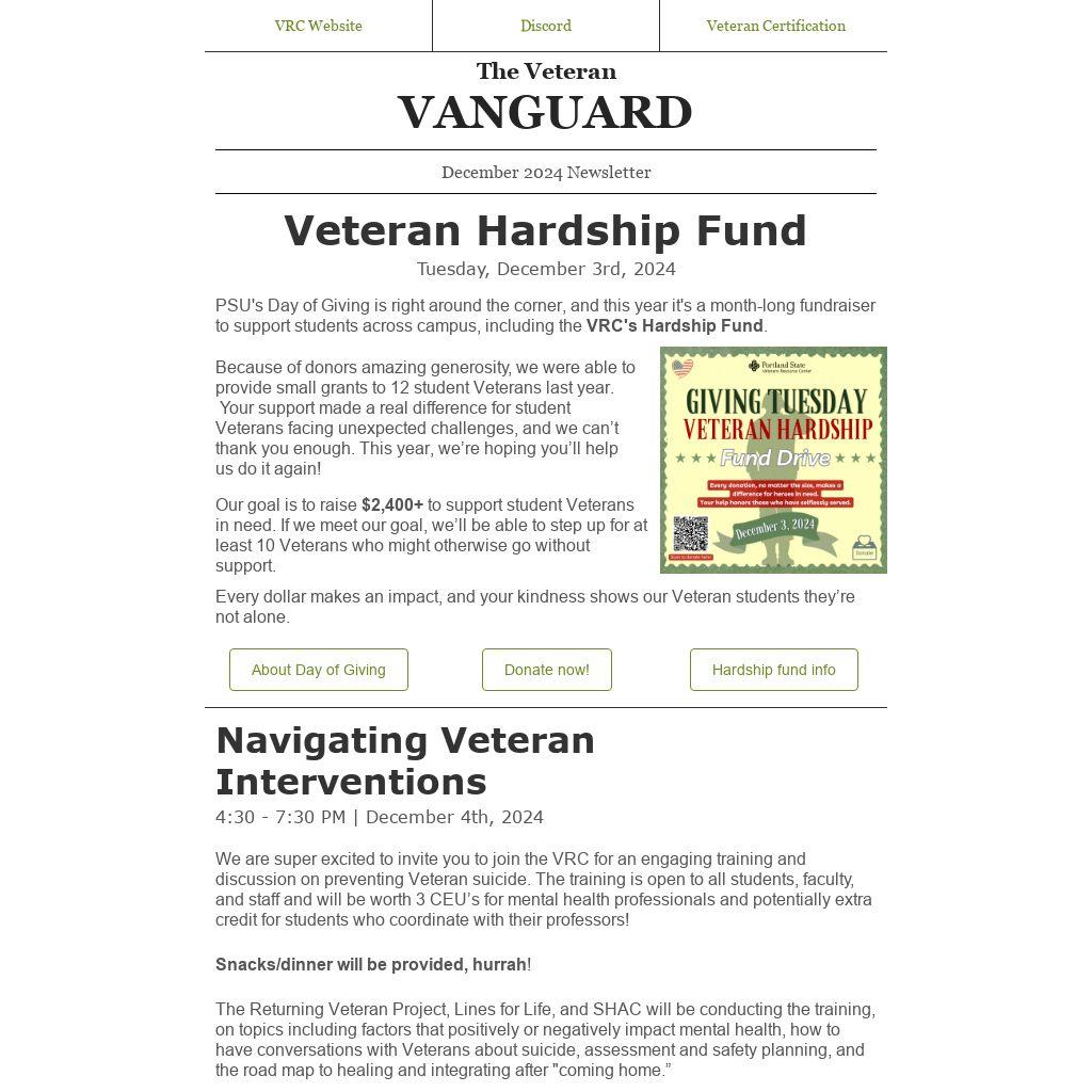 Our goal is to raise $2,400+ to support student Veterans in need. If we meet our goal, we’ll be able to step up for at least 10 Veterans who might otherwise go without support.