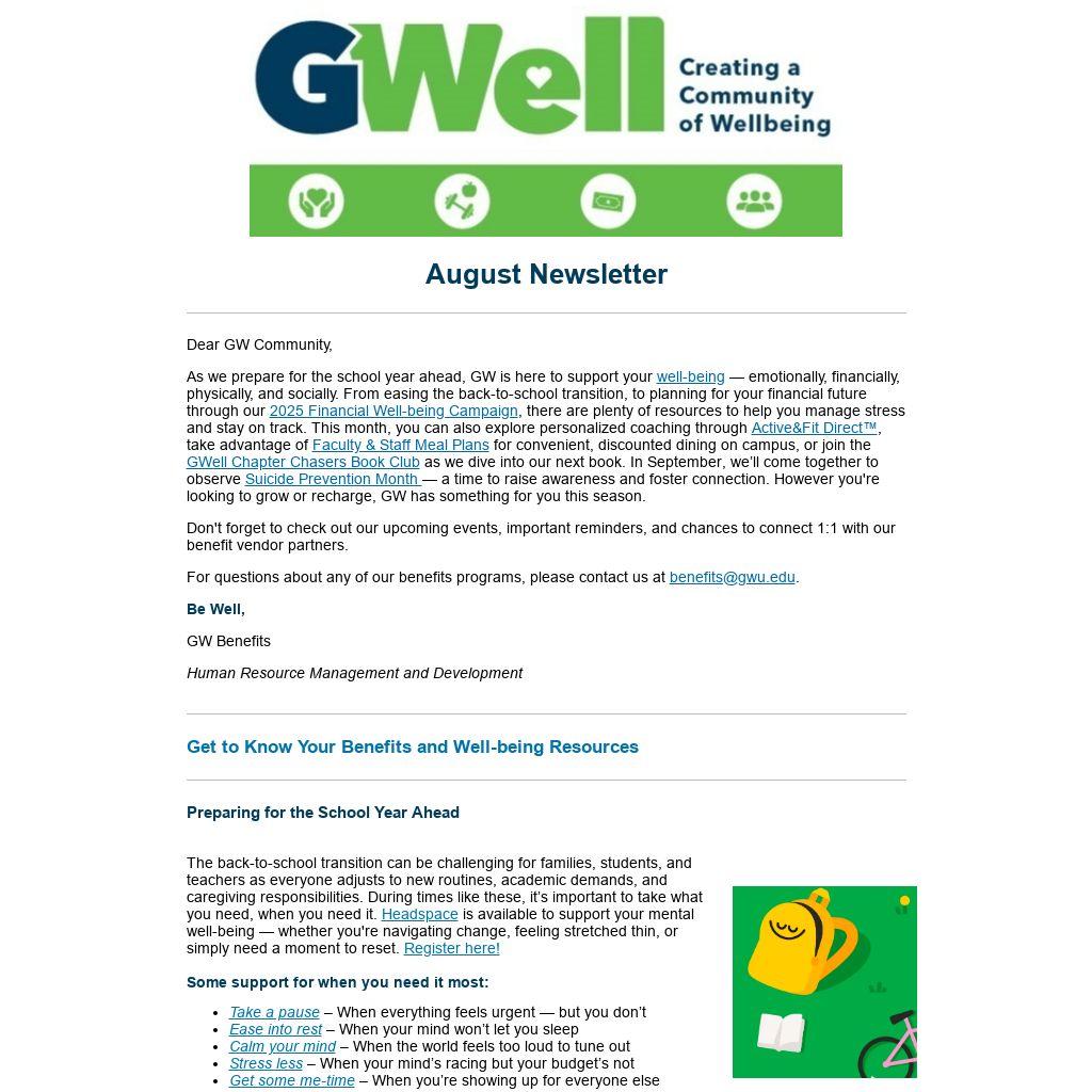 As we prepare for the school year ahead, GW is here to support your well-being — emotionally, financially, physically, and socially. From easing the back-to-school transition, to planning for your financial future through our 2025 Financial Well-being Campaign, there are plenty of resources to help you manage stress and stay on track. This month, you can also explore personalized coaching through Active&Fit Direct™, take advantage of Faculty & Staff Meal Plans for convenient, discounted dining on campus, or join the GWell Chapter Chasers Book Club as we dive into our next book. In September, we’ll come together to observe Suicide Prevention Month — a time to raise awareness and foster connection. However you're looking to grow or recharge, GW has something for you this season.