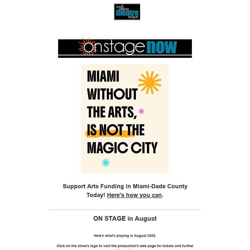 This email blast and other programs of the South Florida Theatre League are made possible with the support of Miami-Dade County Department of Cultural Affairs and the Cultural Affairs Council, the Miami-Dade County Mayor and Board of County Commissioners.