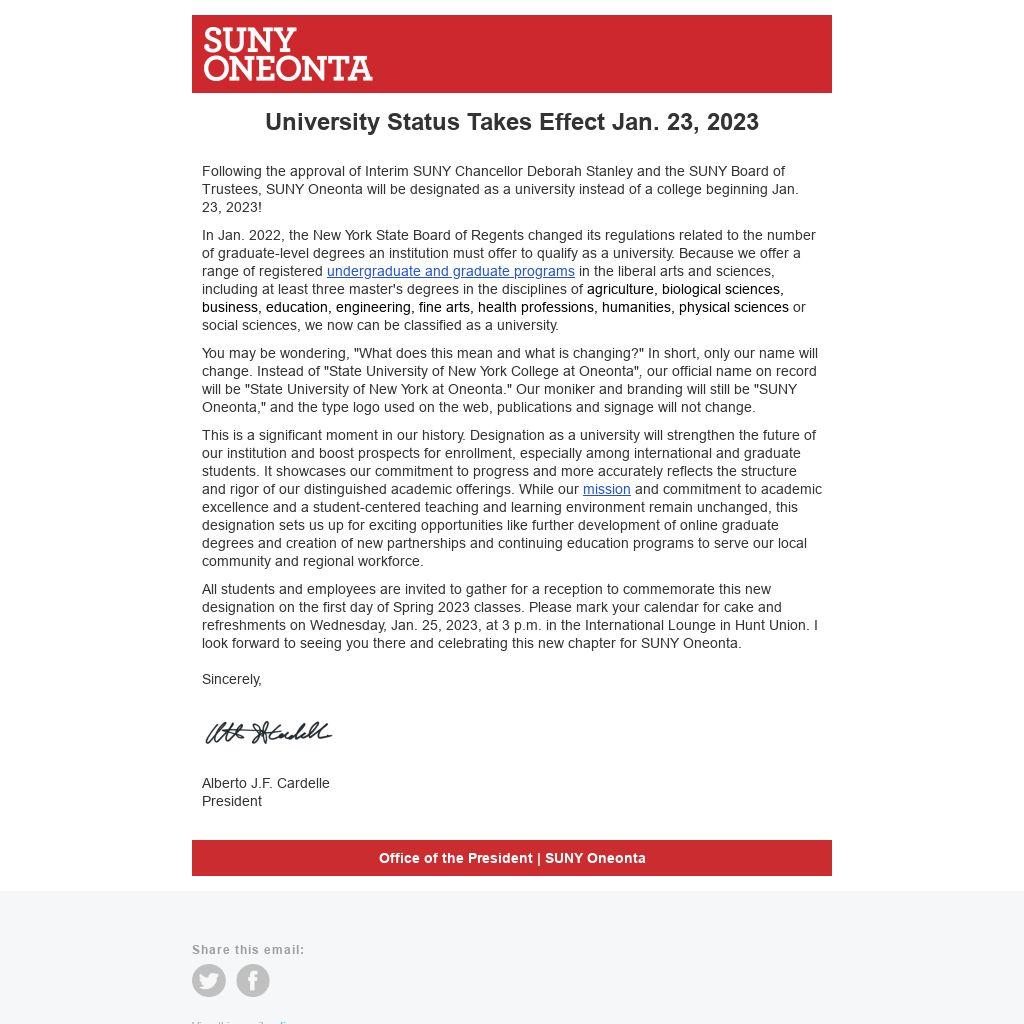 All students and employees are invited to gather for a reception to commemorate this new designation on the first day of Spring 2023 classes. Please mark your calendar for cake and refreshments on Wednesday, Jan. 25, 2023, at 3 p.m. in the International Lounge in Hunt Union. I look forward to seeing you there and celebrating this new chapter for SUNY Oneonta.