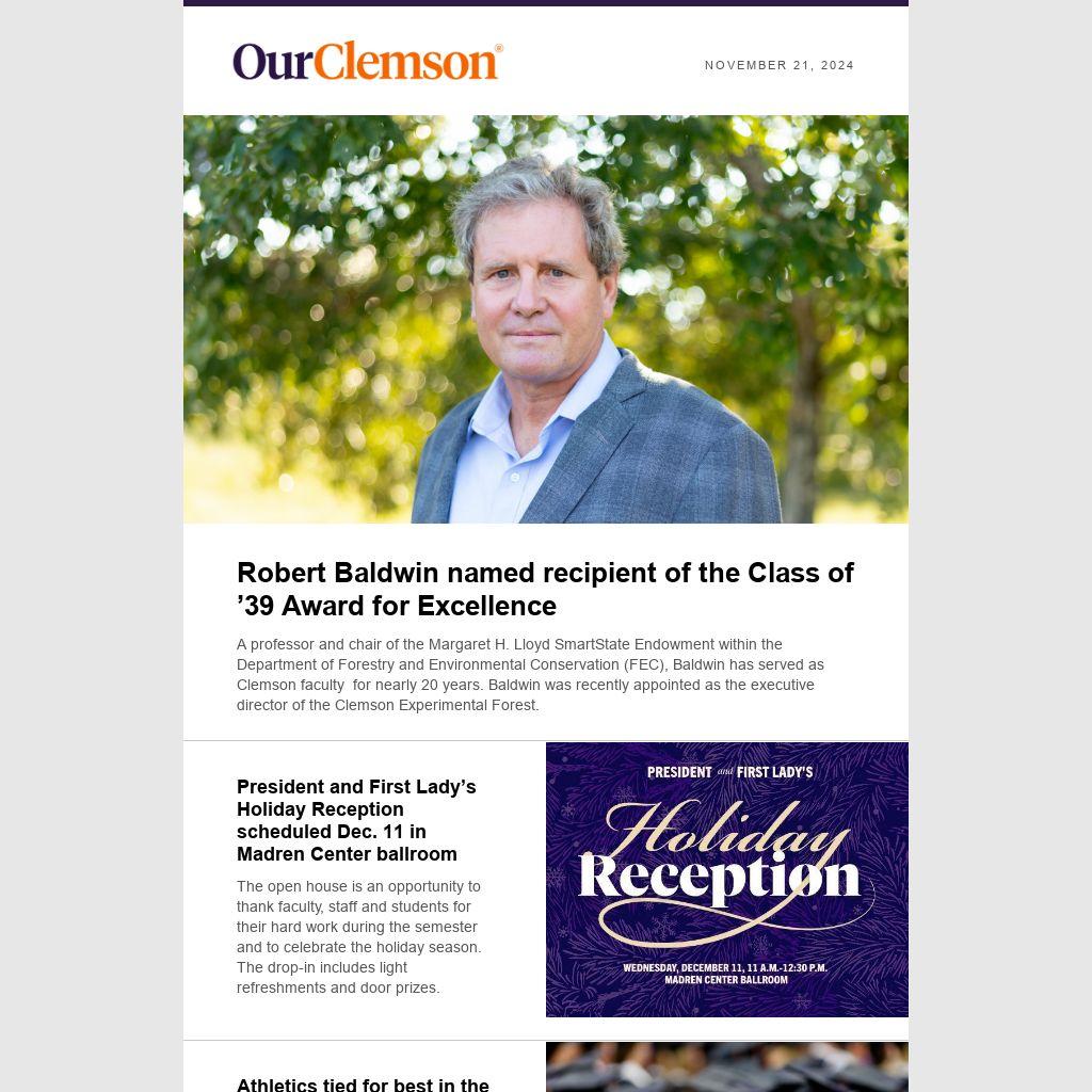 A professor and chair of the Margaret H. Lloyd SmartState Endowment within the Department of Forestry and Environmental Conservation (FEC), Baldwin has served as Clemson faculty for nearly 20 years. Baldwin was recently appointed as the executive director of the Clemson Experimental Forest.