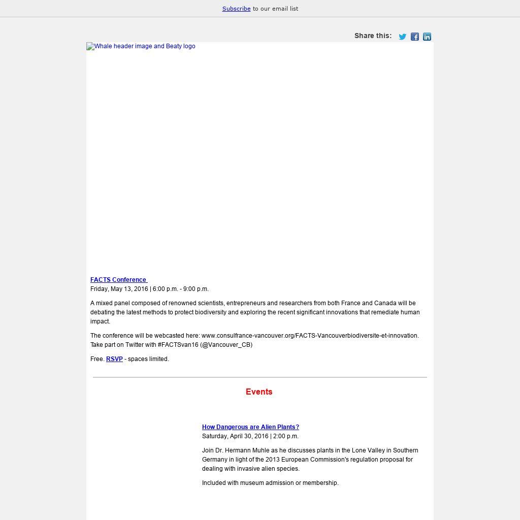 The conference will be webcasted here: www.consulfrance-vancouver.org/FACTS-Vancouverbiodiversite-et-innovation. Take part on Twitter with #FACTSvan16 (@Vancouver_CB)