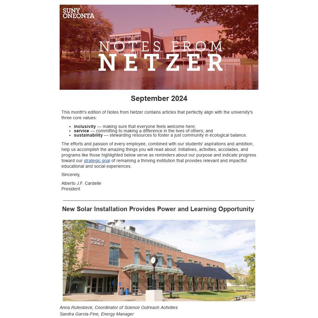 Notes from meetings of the President's Cabinet are shared with the university community monthly in Notes from Netzer. Questions can be directed to president@oneonta.edu.