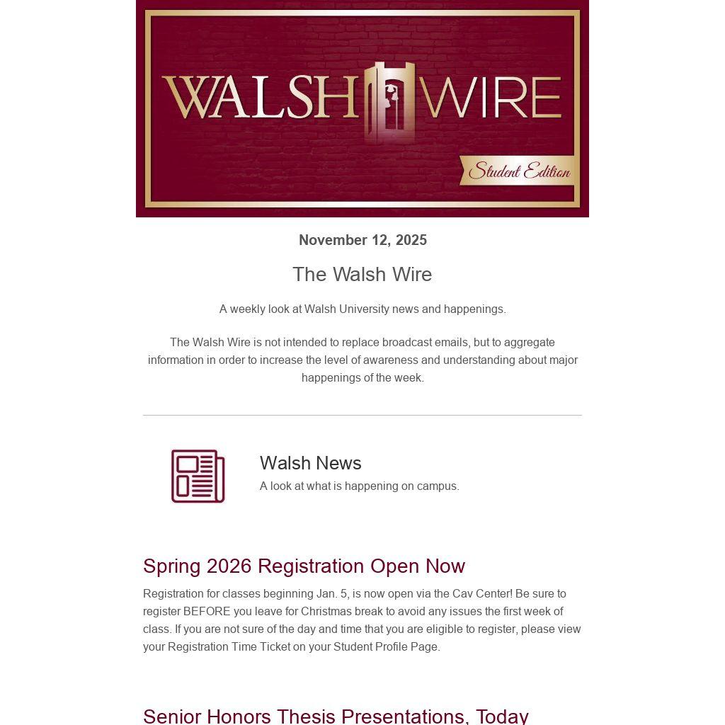 The Walsh Wire is not intended to replace broadcast emails, but to aggregate information in order to increase the level of awareness and understanding about major happenings of the week.