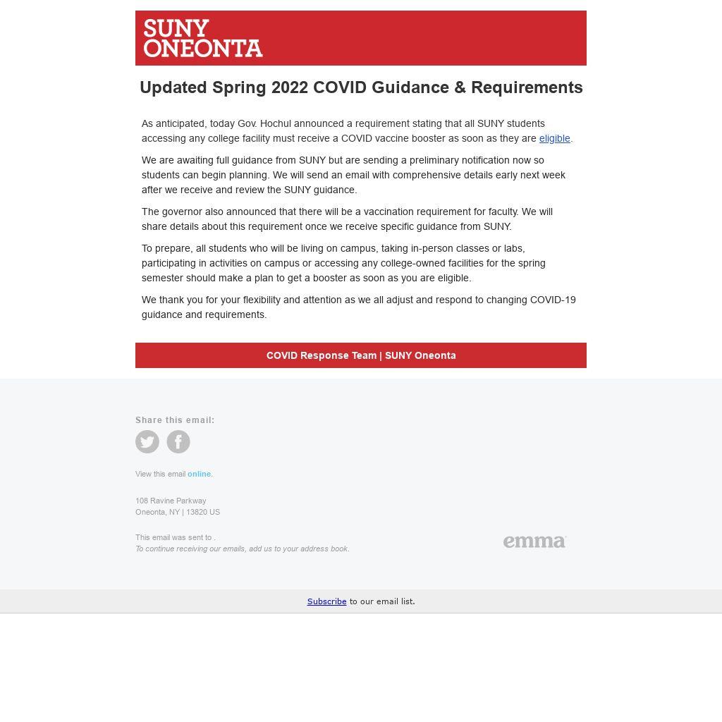 As anticipated, today Gov. Hochul announced a requirement stating that all SUNY students accessing any college facility must receive a COVID vaccine booster as soon as they are eligible.