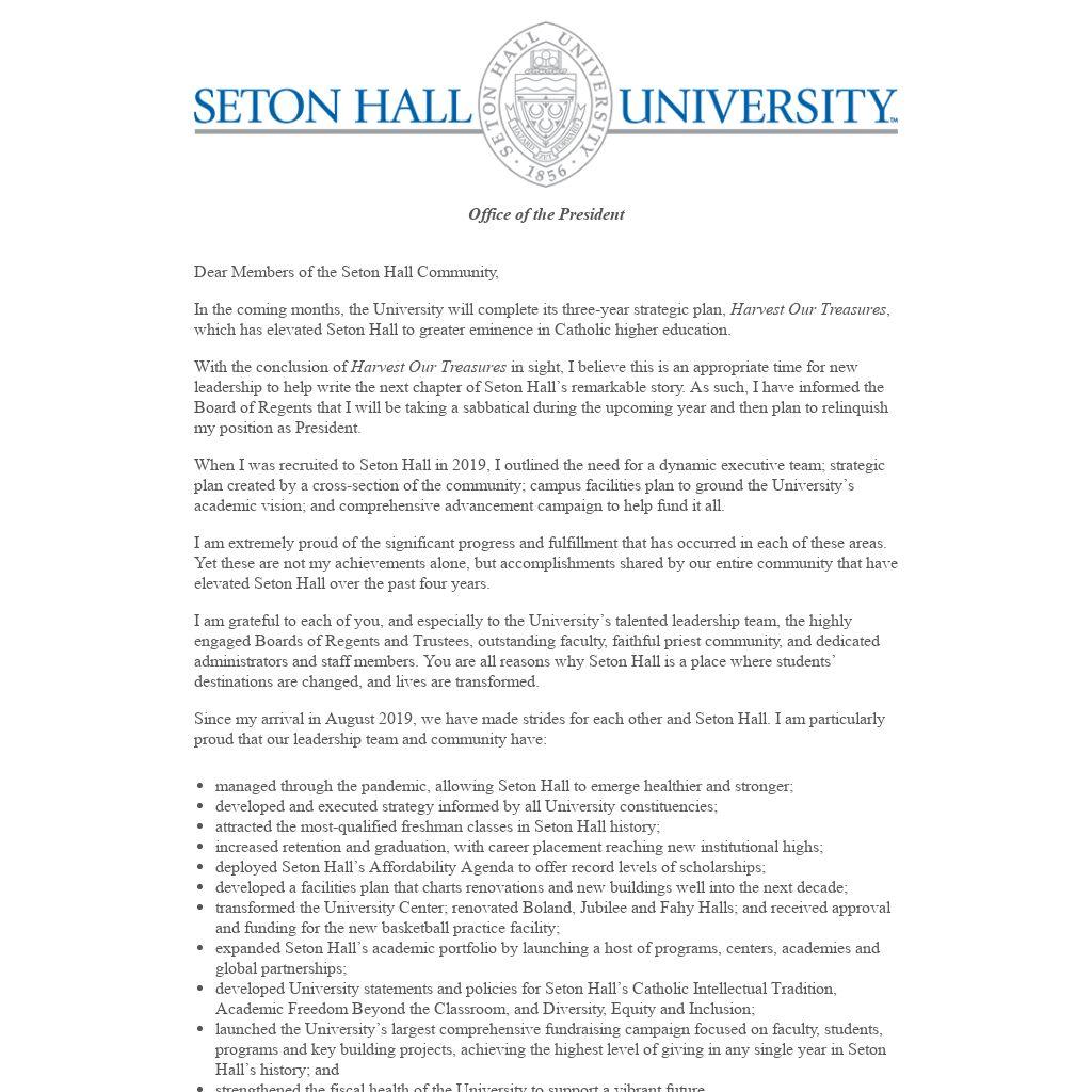 With the conclusion of Harvest Our Treasures in sight, I believe this is an appropriate time for new leadership to help write the next chapter of Seton Hall’s remarkable story. As such, I have informed the Board of Regents that I will be taking a sabbatical during the upcoming year and then plan to relinquish my position as President.