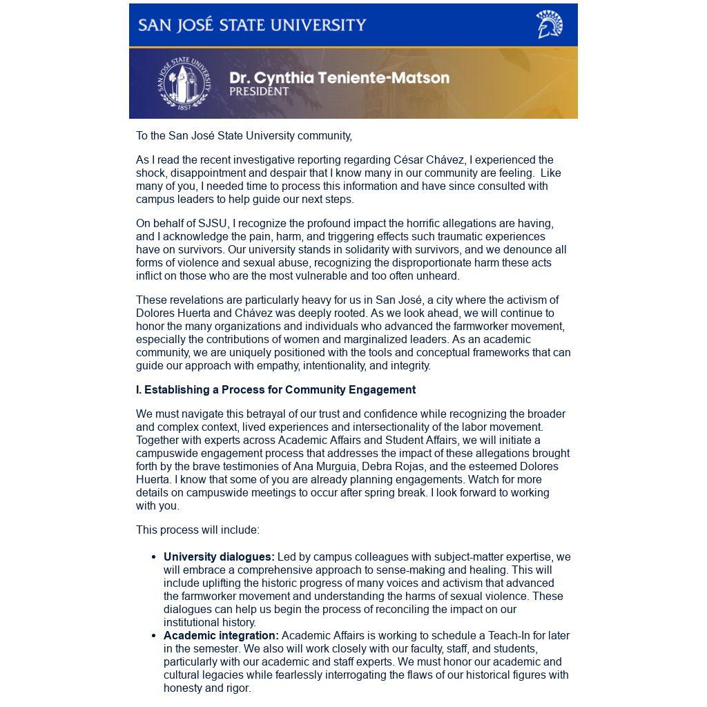 To the San José State University community,