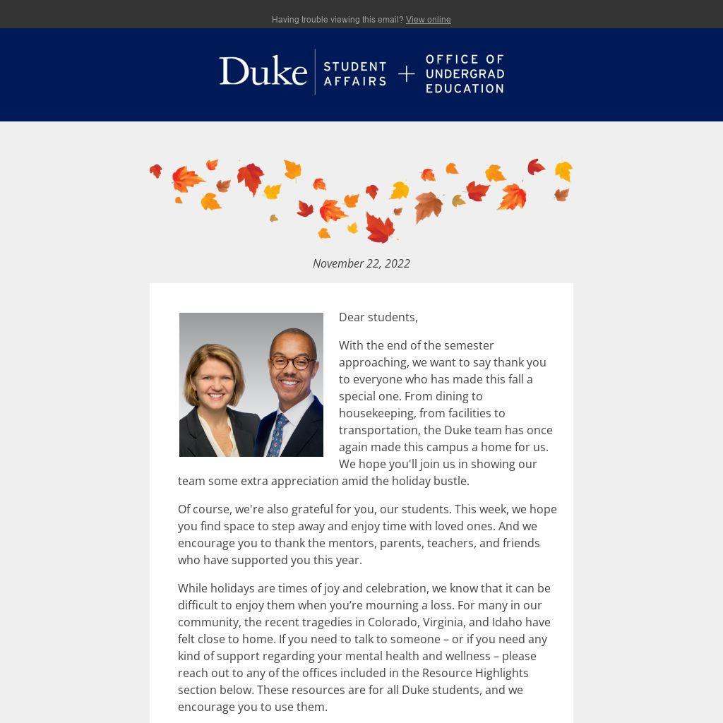 While holidays are times of joy and celebration, we know that it can be difficult to enjoy them when you’re mourning a loss. For many in our community, the recent tragedies in Colorado, Virginia, and Idaho have felt close to home. If you need to talk to someone – or if you need any kind of support regarding your mental health and wellness – please reach out to any of the offices included in the Resource Highlights section below. These resources are for all Duke students, and we encourage you to use them.