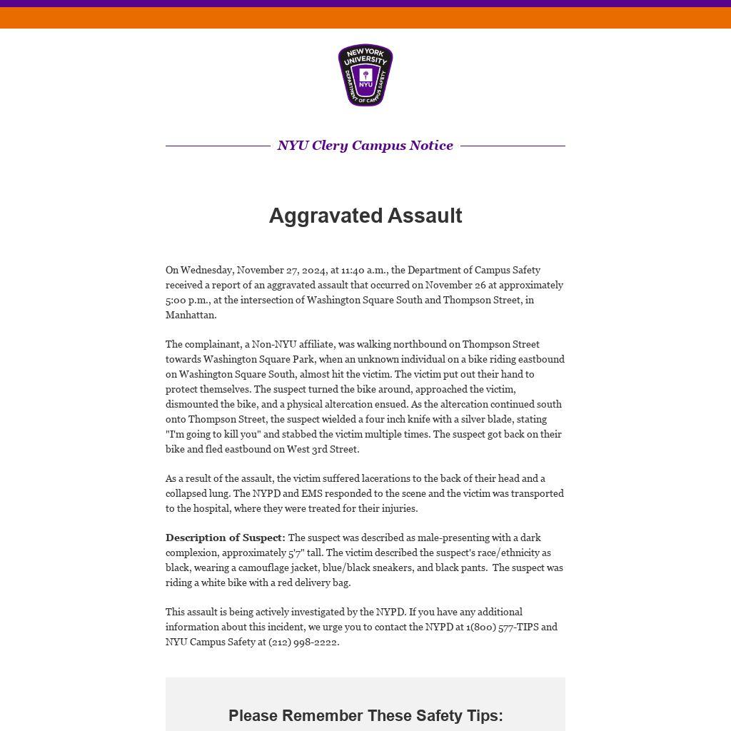 On Wednesday, November 27, 2024, at 11:40 a.m., the Department of Campus Safety received a report of an aggravated assault that occurred on November 26 at approximately 5:00 p.m., at the intersection of Washington Square South and Thompson Street, in Manhattan.