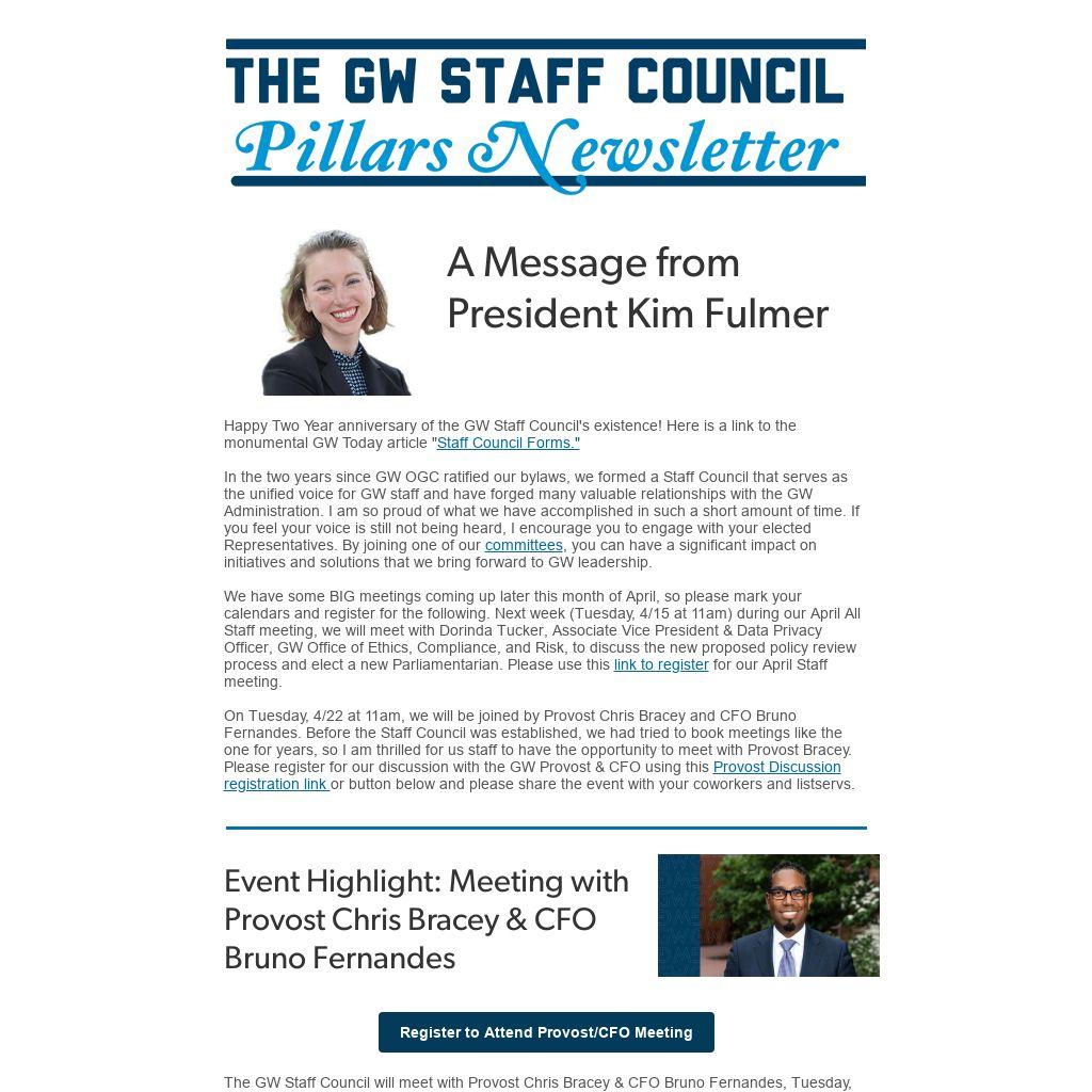 On Tuesday, 4/22 at 11am, we will be joined by Provost Chris Bracey and CFO Bruno Fernandes. Before the Staff Council was established, we had tried to book meetings like the one for years, so I am thrilled for us staff to have the opportunity to meet with Provost Bracey. Please register for our discussion with the GW Provost & CFO using this Provost Discussion registration link or button below and please share the event with your coworkers and listservs.