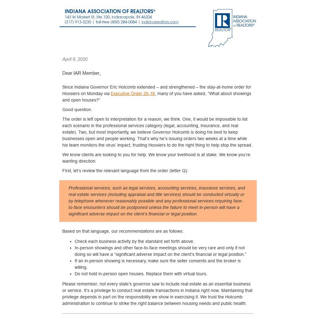 Since Indiana Governor Eric Holcomb extended – and strengthened – the stay-at-home order for Hoosiers on Monday via Executive Order 20-18, many of you have asked, “What about showings and open houses?”