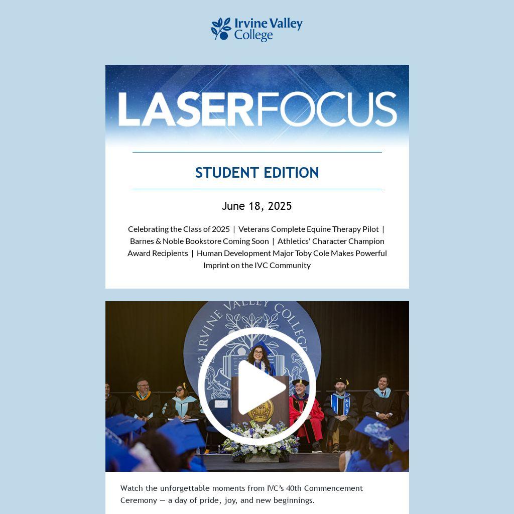 Celebrating the Class of 2025 | Veterans Complete Equine Therapy Pilot | Barnes & Noble Bookstore Coming Soon | Athletics' Character Champion Award Recipients | Human Development Major Toby Cole Makes Powerful Imprint on the IVC Community