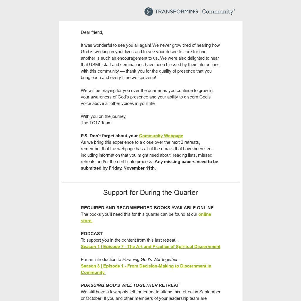 We will be praying for you over the quarter as you continue to grow in your awareness of God’s presence and your ability to discern God’s voice above all other voices in your life.