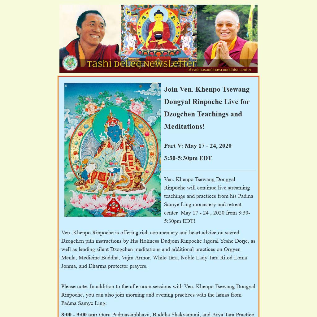 Ven. Khenpo Tsewang Dongyal Rinpoche will continue live streaming teachings and practices from his Padma Samye Ling monastery and retreat center May 17 - 24 , 2020 from 3:30-5:30pm EDT!