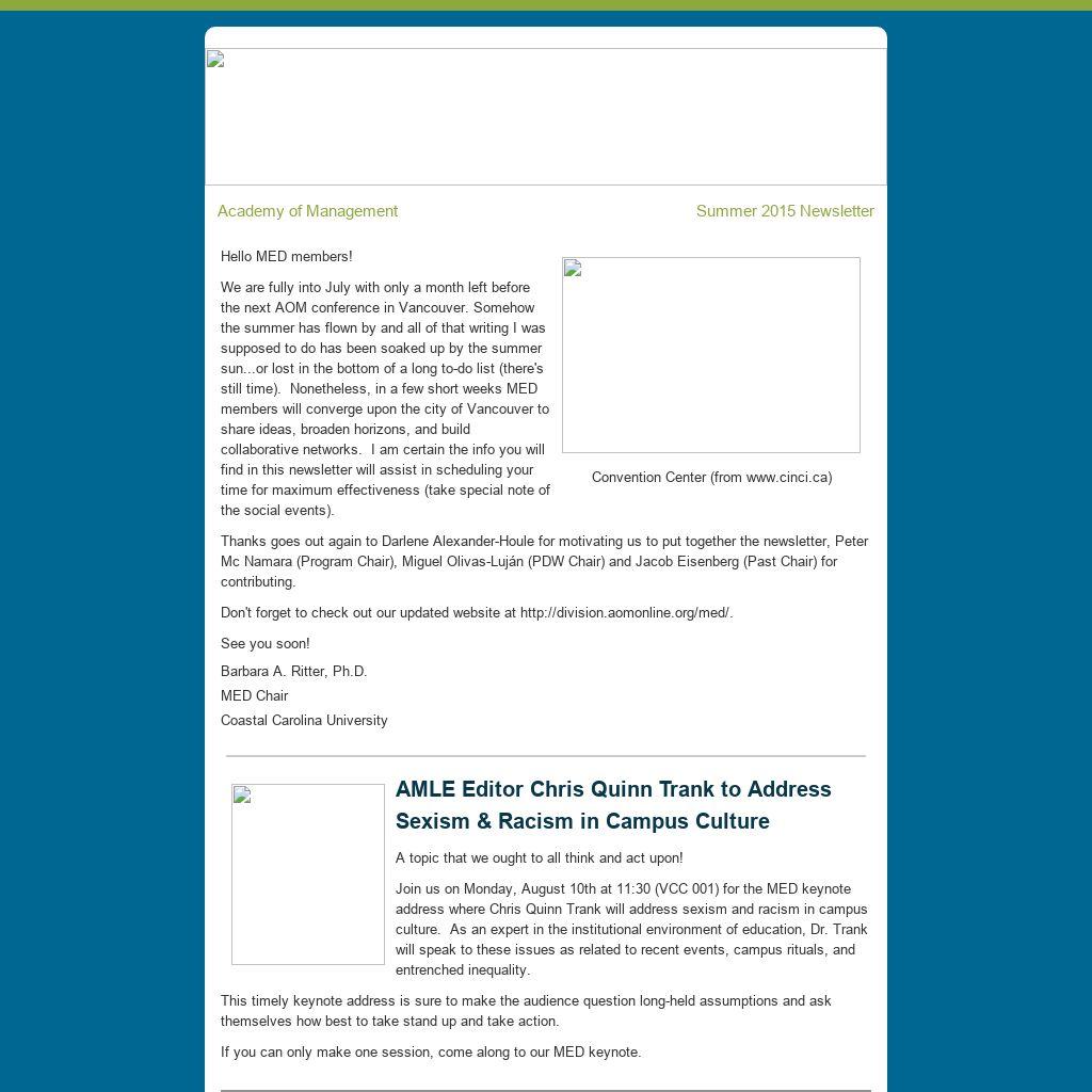 | Hello MED members! We are fully into July with only a month left before the next AOM conference in Vancouver. Somehow the summer has flown by and all of that writing I was supposed to do has been soaked up by the summer sun...or lost in the bottom of a long to-do list (there's still time). Nonetheless, in a few short weeks MED members will converge upon the city of Vancouver to share ideas, broaden horizons, and build collaborative networks. I am certain the info you will find in this newsletter will assist in scheduling your time for maximum effectiveness (take special note of the social events). Thanks goes out again to Darlene Alexander-Houle for motivating us to put together the newsletter, Peter Mc Namara (Program Chair), Miguel Olivas-Luján (PDW Chair) and Jacob Eisenberg (Past Chair) for contributing.