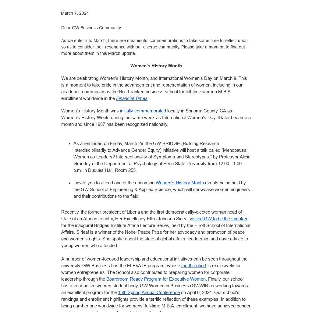 - As a reminder, on Friday, March 29, the GW-BRIDGE (Building Research Interdisciplinarily to Advance Gender Equity) initiative will host a talk called “Menopausal Women as Leaders? Intersectionality of Symptoms and Stereotypes,” by Professor Alicia Grandey of the Department of Psychology at Penn State University from 12:00 - 1:00 p.m. in Duquès Hall, Room 255.