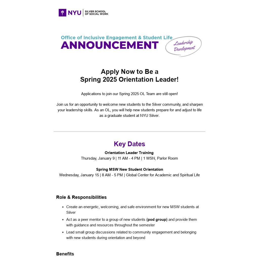 Join us for an opportunity to welcome new students to the Silver community, and sharpen your leadership skills. As an OL, you will help new students prepare for and adjust to life as a graduate student at NYU Silver.