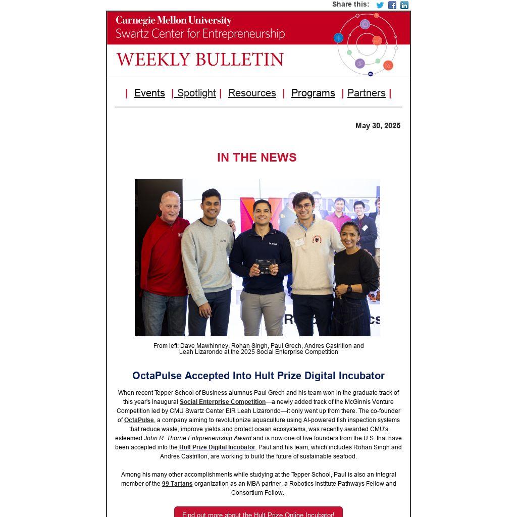 Have startup news or opportunities to share? Have questions about the Swartz Center Weekly Bulletin? Send news, opportunities or questions to Sonya Ford, Program Manager.